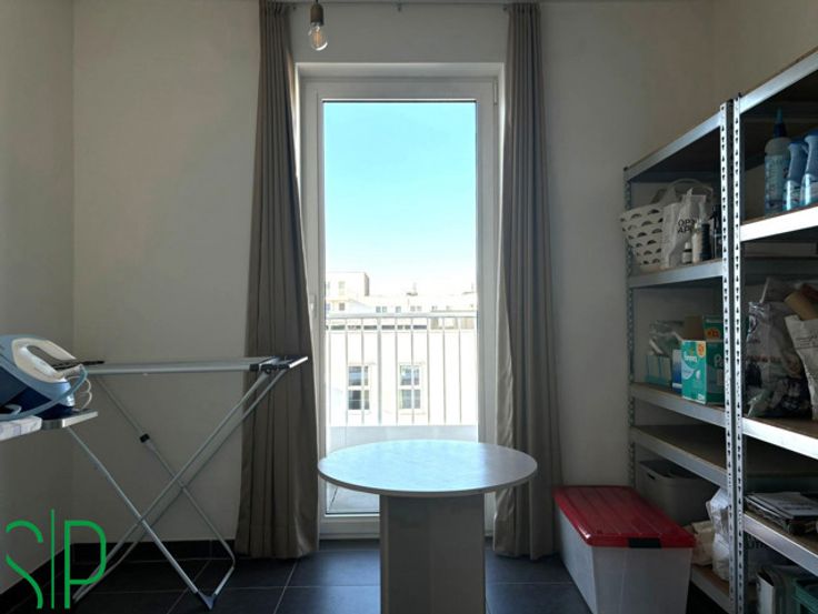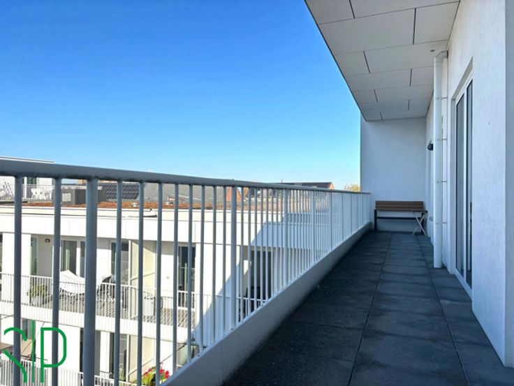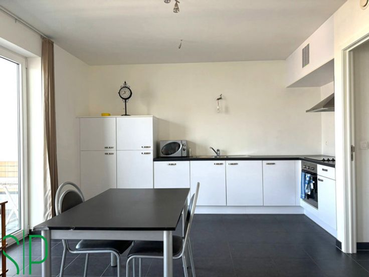 Het appartement heeft de volgende indeling: Men komt binnen via de inkomhal met apart toilet. Vanuit de inkomhal bereikt men de lichtrijke living met open keuken (tegels, kasten, koelkast, vaatwasser, spoelbak, dampkap, keramisch kookvuur en oven; 34m²). aansluitend aan de keuken is nog een wasplaats voorzien (tegels, aansluiting wasmachine; 3m²). Verder beschikt het appartement nog over een berging, 2 slaapkamers (tegels; 7m² en 10m²) waarvan de grootste met een ensuit dressing en een groot terras van 21m².
