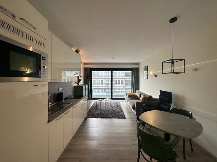 Deze charmante studio, perfect gelegen in het hart van Oostende, biedt de ideale mix van comfort en stijl. De ruime woonkamer met open keuken is licht en uitnodigend, ideaal voor ontspannen avonden of gezellige diners. Direct vanuit de woonkamer heeft u toegang tot een klein terras met lateraal zeezicht, waar u kunt genieten van de zeebries en het uitzicht.