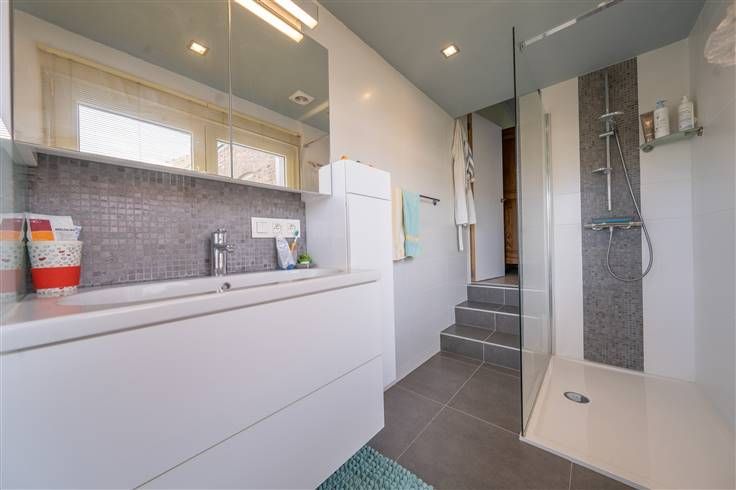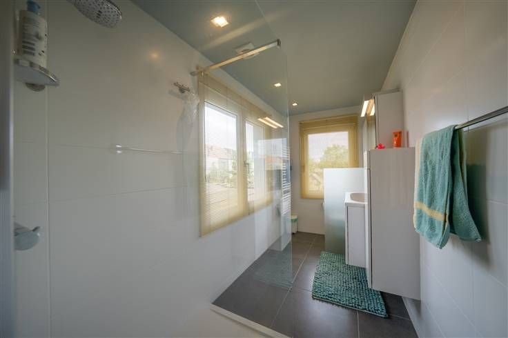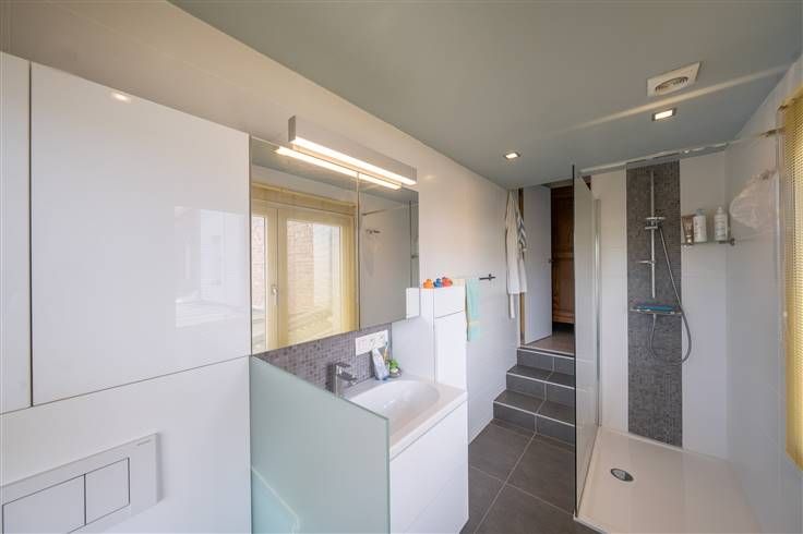 Eerste verdieping (43m2): sas/hall, slaapkamer 1 (3m70x3m80) langs de voorzijde, slaapkamer 2 (3m80x3m30) aan de achterzijde, deze ruimte geeft toegang tot de zolder en de badkamer, mooie badkamer (1m60x3m40) met douche, meubel met wastafel en WC