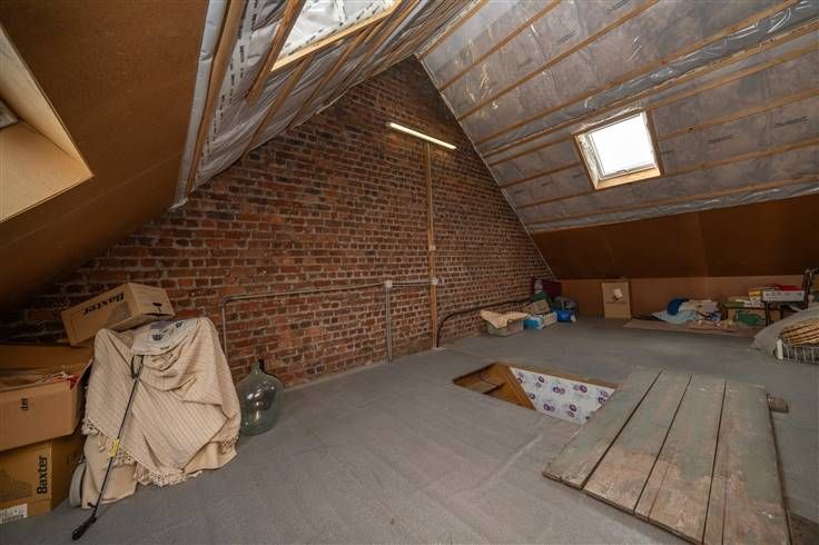 Zolder (26m2): toegankelijk via een vaste trap in de achterste slaapkamer, mooie, in te richten ruimte, dak geïsoleerd (18cm), 3 veluxramen in PVC in het dak