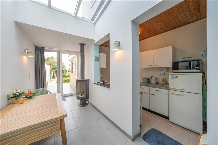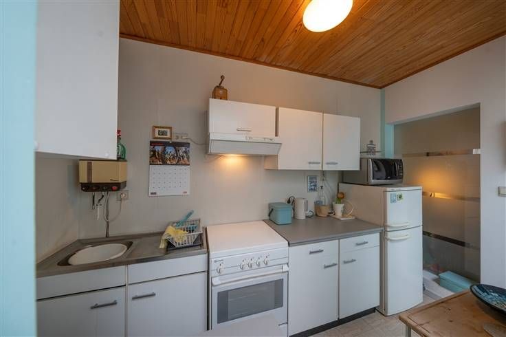 Gelijkvloers (66m2): voorplaats (3m65x3m80) met een gaskachel, trap naar de verdieping, zitplaats (3m30x3m80), veranda met eetgedeelte (1m80x4m70) en een gaskachel, open keuken (1m60x3m45), WC (1m15x1m00) met wastafeltje en ingebouwde kast, berging (1m65x3m25), terras en verzorgde tuin