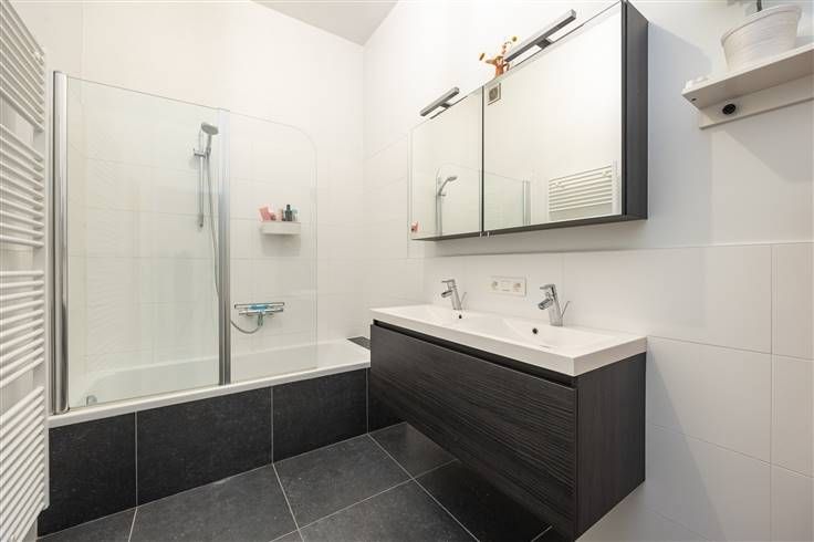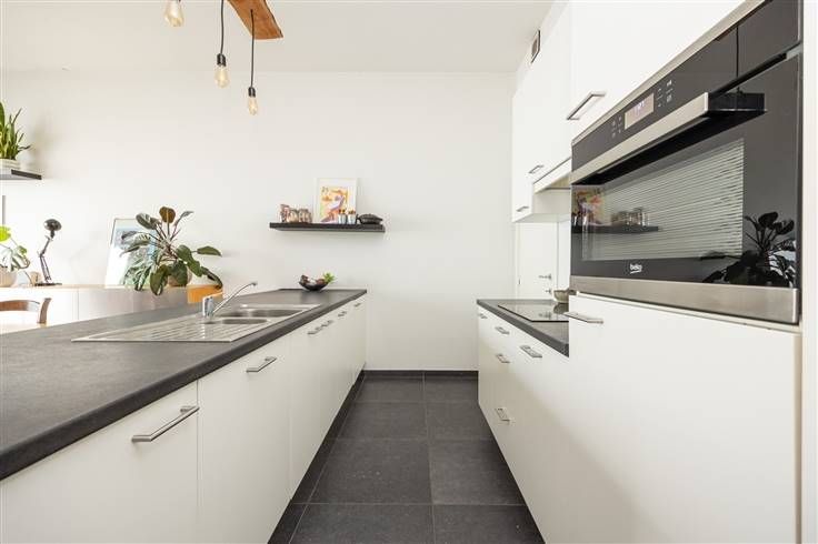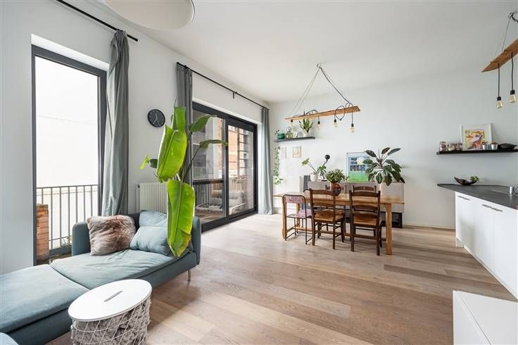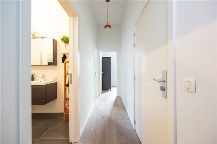 Uniek, energiezuinig appartement met 2 slaapkamers, groot terras en EPC A in gebouw van 2015 Je vindt het appartement op de eerste verdieping. De warme parketvloer in de hal, loopt door over het hele appartement. Je hebt hier in de hal ook een apart gastentoilet met lavabo en een handige vestiaireruimte. Van hieruit gaat het richting leefruimte: een enorm lichte, L-vormige ruimte met hoge plafonds, heel wat grote ramen, betegelde keuken mét kookeiland! Die keuken komt met alles erop en eraan, van een inductievuur, dampkap, dubbele inox spoelbak, oven, koelkast, diepvries, vaatwasser tot enorm veel kastruimte. Achter de keuken bevindt zich een handige, berging, die ook functioneert als wasruimte. De brede schuiframen in de leefruimte geven toegang tot het toffe terras, dat over de hele breedte van appartement loopt. Weer in de hal, passeer je eerst de badkamer op weg naar de twee slaapkamers. Die is betegeld en lekker ruim. Je hebt hier een ligbad met douchescherm, dubbele lavabo met groot meubel, spiegelkast met verlichting en handdoekendroger. Ook in de twee lichte slaapkamers vind je diezelfde warme parketvloer terug, waarbij de kleinste kamer een prima kinderkamer kan worden en de master bedroom plaats genoeg heeft voor een dubbel bed en een grote kast. Verder is er nog een gemeenschappelijke fietsenstalling en privatieve kelderberging Momenteel verhuurd t/m aug 2026 voor meer info: https://www.immovasta.be/panden/gegevens/13582/