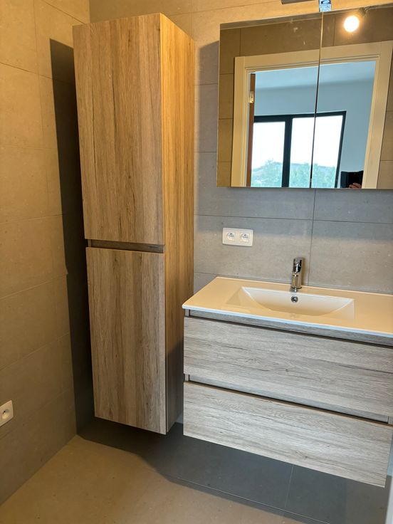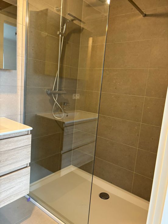 Badkamer met inloopdouche en badkamermeubel. Vloerverwarming.
