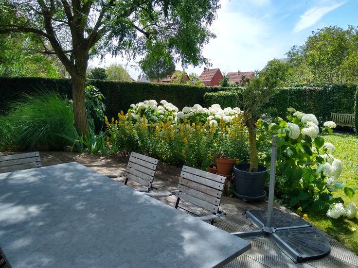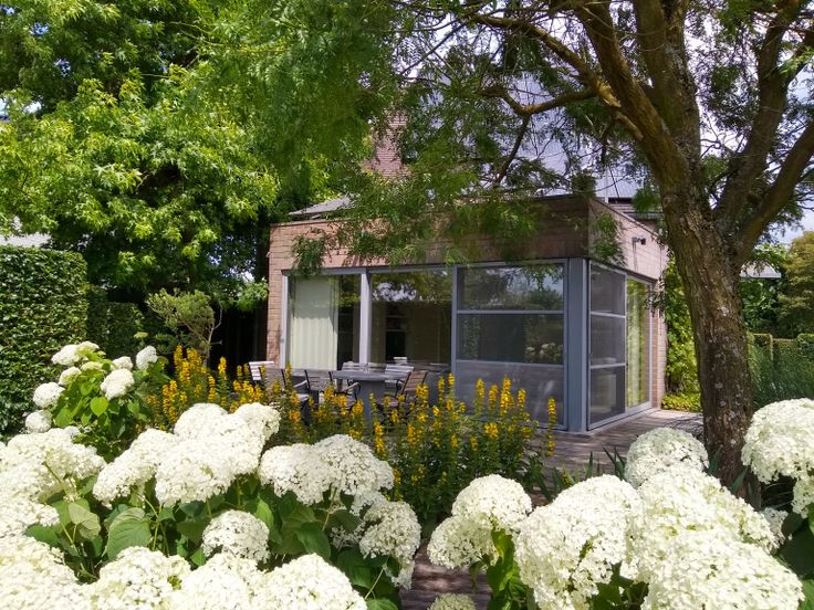 Aangelegde tuin met schaduwrijk terras en veel privacy.