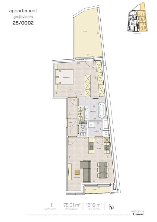 Appartement 0002 is een éénslaapkamerappartement op de gelijkvloerse verdieping met een bewoonbare oppervlakte van 75 m² en een totale terrasoppervlakte van maar liefst 16 m². De woonkamer, met open keuken, die uitgeeft op het terras, is gelegen aan de zuidkant waardoor je volop kan genieten van de zon. Verder is er een berging, een badkamer met een ligbad en een wastafel en daarnaast ook een apart wc. De ruime slaapkamer is aan de achterkant van het appartement gelegen en geeft toegang tot het grote terras waar het heerlijk vertoeven is. In de kelder van het gebouw bevindt zich een gemeenschappelijke fietsenberging. Residentie Umarell is op 150 meter van de zeedijk gelegen en op wandelafstand van de tramhalte en lokale winkels en horeca. De werken beginnen na Pasen 2025 en de oplevering zal zijn voor de zomer van 2027.