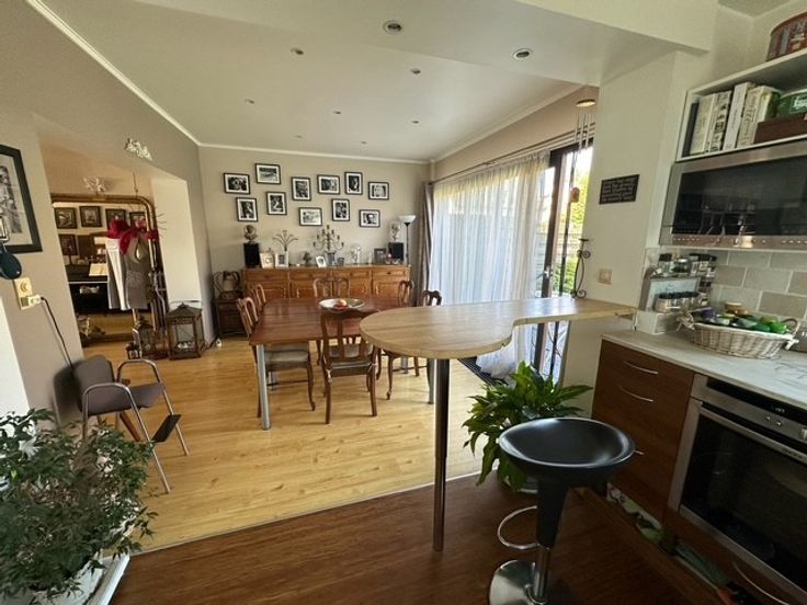 Le hall d’entrée donne accès à un bureau, idéal pour le télétravail ou les études. Le séjour de 60 m², baigné de lumière grâce à ses grandes baies vitrées, se prolonge sur une cuisine semi-ouverte de 12m2 entièrement équipée, offrant un cadre parfait pour recevoir famille et amis.