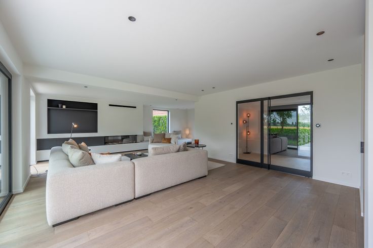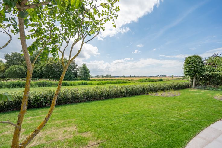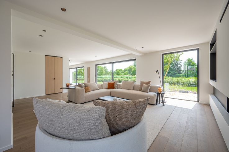 Ruime inkomhal met gastentoilet, gezellige woon- en eetkamer, volledig afgewerkt in parket, voorzien van een sfeervolle open gashaard en directe toegang tot het zwembad, terras en de aangelegde tuin. De moderne leefkeuken met kookeiland beschikt over een koelcel, praktische berging en een handige wasplaats. De zuidgerichte tuin en het terras garanderen optimale privacy en zijn omgeven door groen.