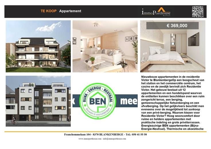 Nieuwbouw appartementen in de residentie Victor te Blankenberge Op een boogscheut van het station en het commerciële centrum, het casino en de zeedijk bevindt zich Residentie Victor. Het gebouw bestaat uit 12 appartementen en een handelspand waarvan de entiteiten kunnen beschikken over een ruim zongericht terras, een berging, gemeenschappelijke fietsenberging en een afvalberging. Op het gelijkvloers beschikt men eveneens over de mogelijkheid tot aankoop van een privé-berging. Waarom kiezen voor Residentie Victor? Hoog wooncomfort door ruime en heldere appartementen met praktische indeling en grote privéterrassen. Energiezuinige BEN appartementen (Bijna-Energie-Neutraal). Thermische en akoestische isolatie van de hoogste standaard (beter dan de norm). Ruim budget voor zowel keukens als badkamers. Vloerverwarming en koeling. Ventilatiesysteem in overeenstemming met de EPB-normering (systeem D).? Waterrecuperatie: hemelwater kan gebruikt worden voor diverse aansluitingen (toilet, wasmachine, buitenkraan…).? Warmtepomp met geothermische boringen. Residentie Victor appartement 03.01 Dit appartement heeft een oppervlakte van 109,98 m² en bestaat uit: ruime living met open keuken en toegang tot het zongericht terras, afzonderlijk toilet, berging met aansluiting wasmachine, badkamer met inloopdouche, twee slaapkamers. Maak een afspraak 050 41 55 50 / email info@immoporthouse.com