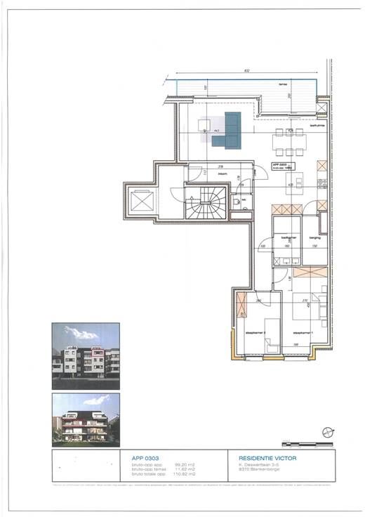 Nieuwbouw appartementen in de residentie Victor te Blankenberge Op een boogscheut van het station en het commerciële centrum, het casino en de zeedijk bevindt zich Residentie Victor. Het gebouw bestaat uit 12 appartementen en een handelspand waarvan de entiteiten kunnen beschikken over een ruim zongericht terras, een berging, gemeenschappelijke fietsenberging en een afvalberging. Op het gelijkvloers beschikt men eveneens over de mogelijkheid tot aankoop van een privé-berging. Waarom kiezen voor Residentie Victor? Hoog wooncomfort door ruime en heldere appartementen met praktische indeling en grote privéterrassen. Energiezuinige BEN appartementen (Bijna-Energie-Neutraal). Thermische en akoestische isolatie van de hoogste standaard (beter dan de norm). Ruim budget voor zowel keukens als badkamers. Vloerverwarming en koeling. Ventilatiesysteem in overeenstemming met de EPB-normering (systeem D).? Waterrecuperatie: hemelwater kan gebruikt worden voor diverse aansluitingen (toilet, wasmachine, buitenkraan…).? Warmtepomp met geothermische boringen. Residentie Victor appartement 03.03 Dit appartement heeft een oppervlakte van 111,98 m² en bestaat uit: ruime living met open keuken en toegang tot het zongericht terras, afzonderlijk toilet, berging met aansluiting wasmachine, badkamer met inloopdouche, twee slaapkamers. Maak een afspraak 050 41 55 50 / email info@immoporthouse.com