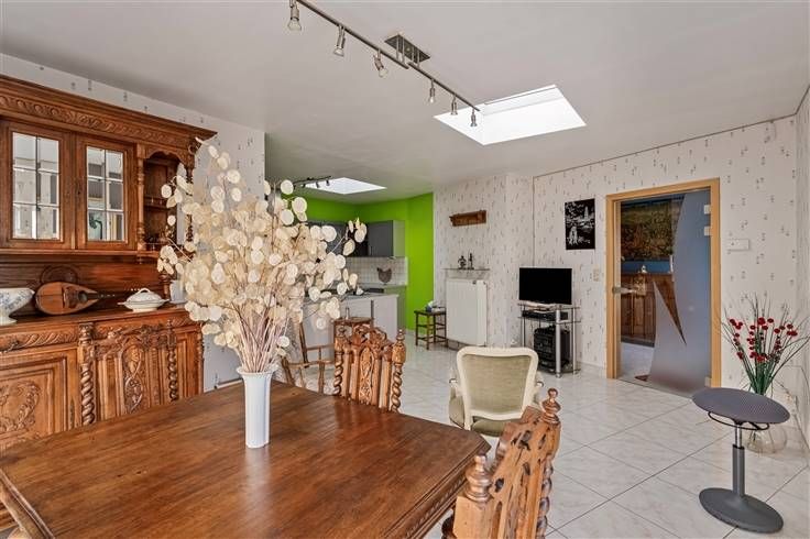 Au 1er étage: un appartement avec WC séparé, un double séjour avec cuisine, une salle de douche et une chambre. Léger rafraichissement à prévoir pour la peinture et la douche.