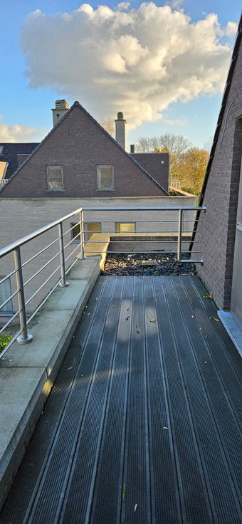 Het ruime terras met meer dan voldoende privacy is in type bankirai en bereikbaar via de leefruimte. Binnen dezelfde leefruimte is er een mediawall (volledig weggewerkte kabels) met TV-hoek, een gezellige pelletkachel, mooie bevloering. Alles akoestisch zeer goed en energetisch geïsoleerd.