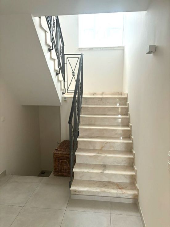 Terug in de villa vindt u vooraan op het gelijkvloers nog een praktijkruimte met aparte inkom en toilet. Op de eerste verdieping vindt u de masterbedroom, op parketvloer, met dressing en ensuite badkamer. De badkamer is ingericht met een ligbad, douche, dubbel lavabomeubel en toilet. Verder zijn er op de verdieping nog 2 ruime slaapkamers en een tweede badkamer. Tenslotte is er nog een zolder die bereikbaar is via een uitschuifbare trap. Het huis heeft ook nog een kelder met veel bergruimte.