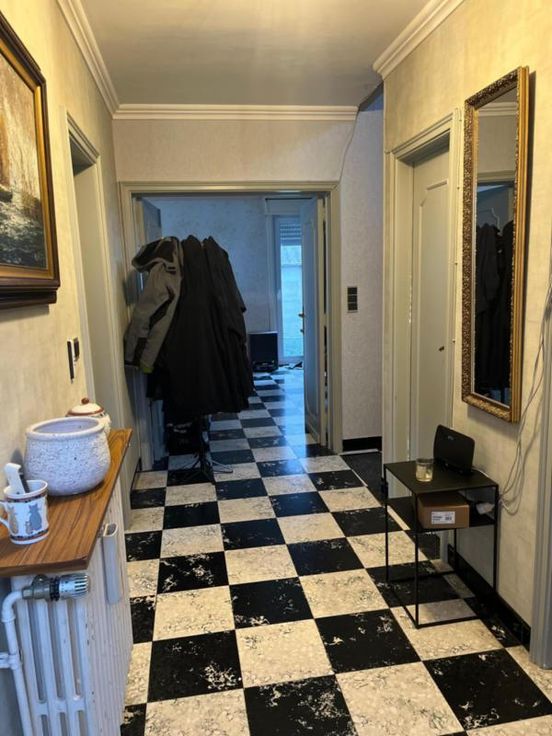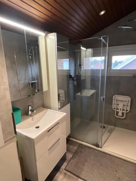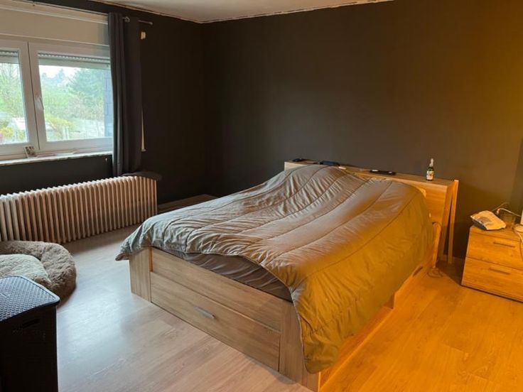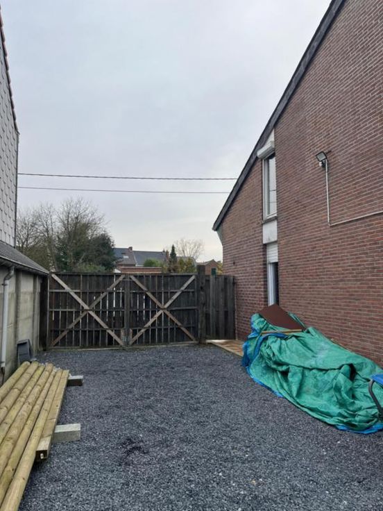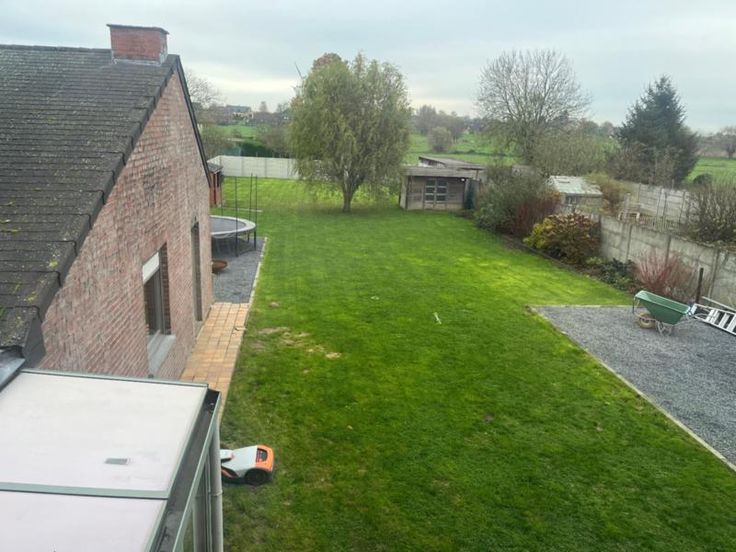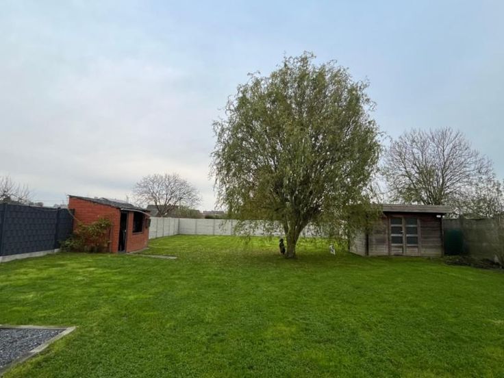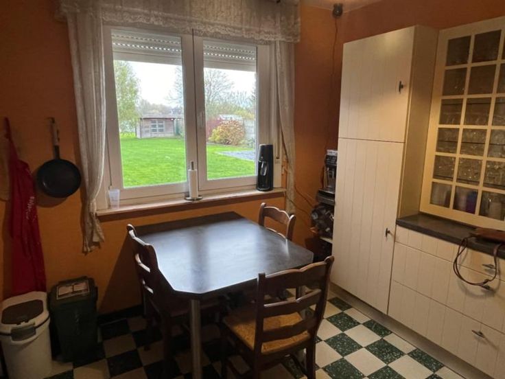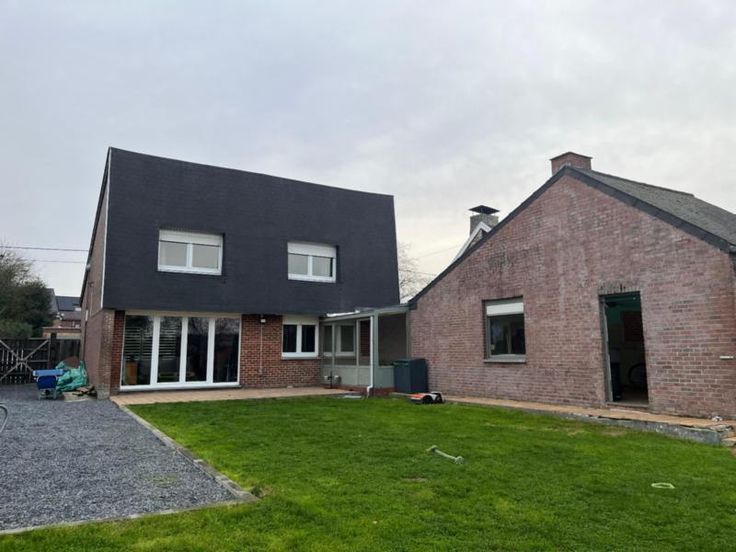 Villa avec et sur 12 ares 30 centiares, se compose au rez-de-chaussée d'un hall d'entrée, d'un wc avec lavabo, d'un bureau, d'une cave, d'une salle à manger et d'un salon avec feu cassette au bois et vue sur le jardin, d'une cuisine semi-équipée avec un coin déjeuner, d'une véranda donnant accès au grand garage avec étage, une terrasse, un jardin entièrement clôturé et un parking extérieur - A l'étage: salle de douche (lavabo et douche italienne), deux chambres et un bureau. Spécificités techniques :double vitrage - chauffage central au mazout - citerne à eau de pluie avec pompe - RC: 1.031,00 €