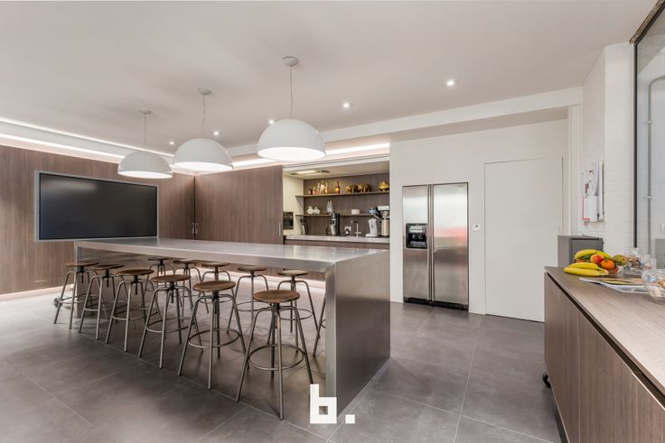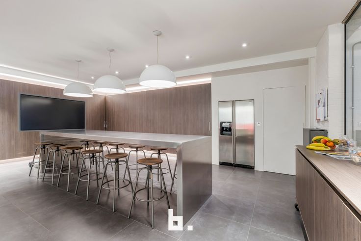 De slimme inrichting, zoals de verschuifbare kastwanden in de volledig uitgeruste keuken, maakt het mogelijk om de ruimte multifunctioneel in te zetten. Zo kan de keuken ook fungeren als vergaderzaal of extra werkruimte.