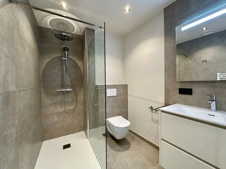 - Ruime en comfortabel ingerichte badkamer met natuurlijk licht, voorzien van inloopdouche, dubbele wastafel met kast en extra toilet.