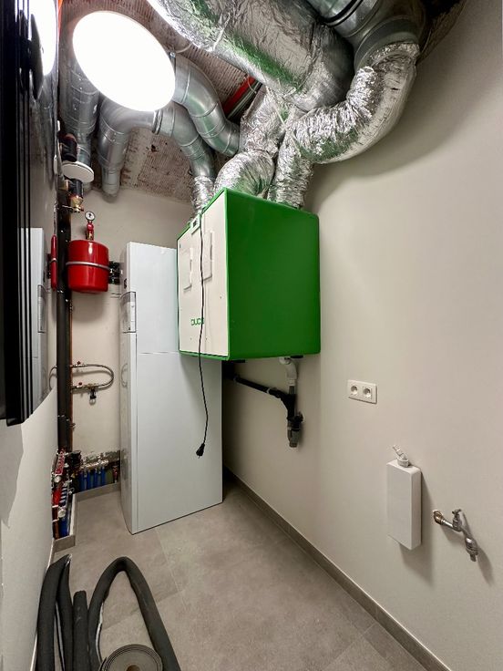 - Technische ruimte voorzien van zekeringskast, warmtepomp, warmtepompboiler, ventilatiesysteem D+, internetaansluiting (Proximus Fibernet en Telenet). Er zijn ook individuele zonnepanelen en een algemene waterverzachter aanwezig.