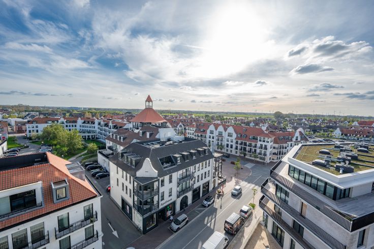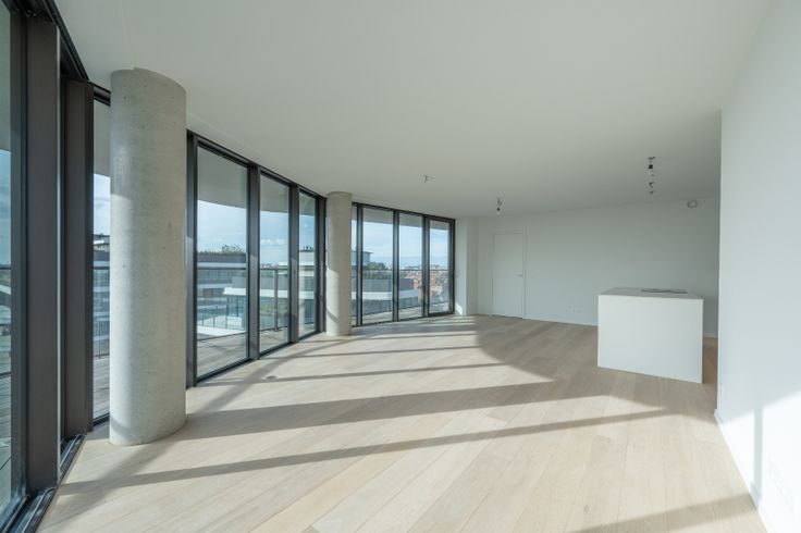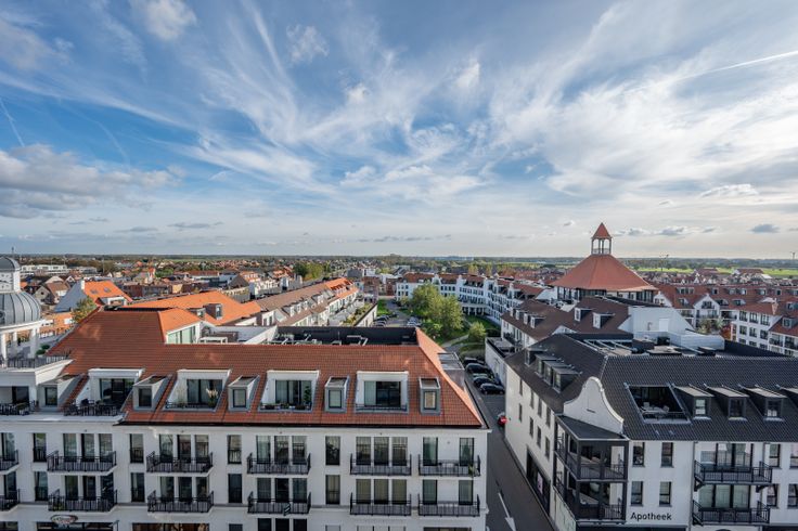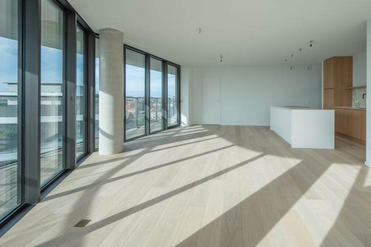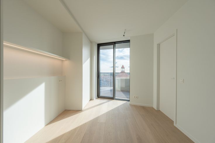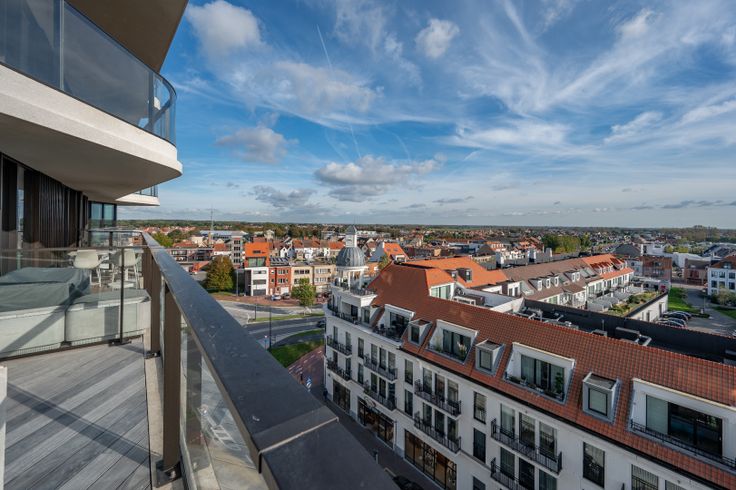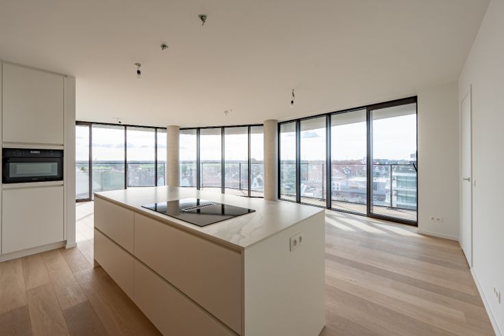 Nieuwbouw hoekappartement met perfecte oriëntatie. Indeling van het appartement gelegen op de 6de verdieping: Inkomhal met vestiaire en gastentoilet. Lichtrijke leefruimte met aansluitend een ruim zonneterras,  met unieke open zichten. Volledig ingerichte open keuken met eiland. Praktische berging. 2 slaapkamers met elk ingemaakte kasten en ensuite badkamer. Het volledig appartement is omringd door een zuid-west georiënteerd terras dewelke heel de dag door geniet van zon. Staanplaats, privatieve kelder en 5 fietshaken in de residentie, inbegrepen in de huurprijs. Gemeenschappelijke kosten: €50/maand Renovatieplicht: nee
