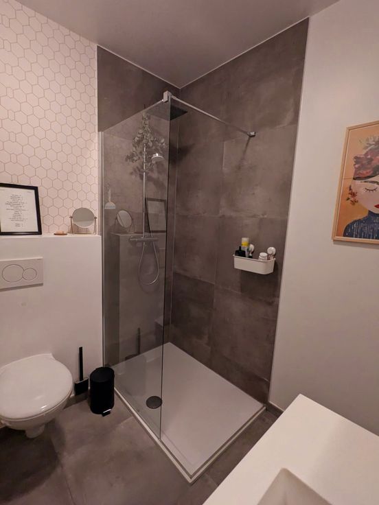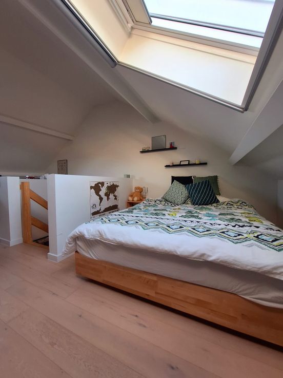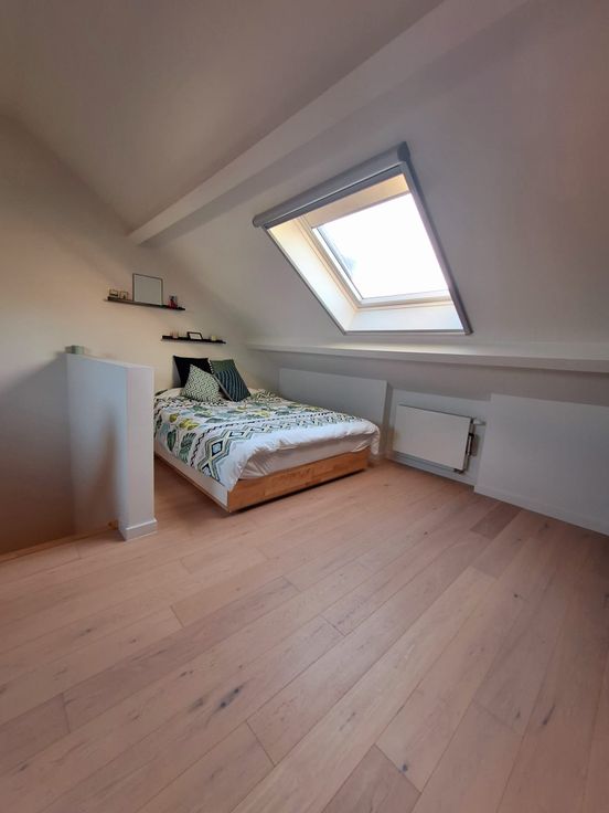 Op de eerste verdieping bevinden zich twee ruime slaapkamers, en een moderne badkamer met een inloopdouche en toilet. De bovenste verdieping biedt een grote zolderkamer, ideaal als extra slaapkamer, bureau of hobbyruimte.