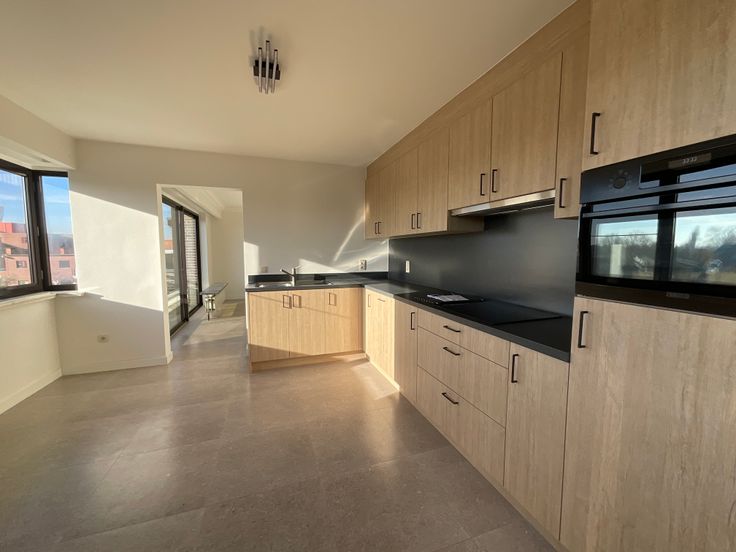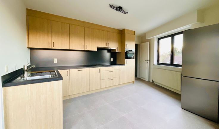 Volledig gerenoveerd appartement in een rustig klein gebouw. Voor het gebouw is er een staanplaats en er is een bijhorende grote garage inbegrepen… Dit gebouw beschikt over een grote inkomhal met brede trap naar het prachtige appartement op de tweede verdieping. Bij het binnenkomen van het appartement is er een ruime hallkast en een apart toilet. Hierna komt u in een grote woonkamer van 8 x 5 m met schuifraam waarbij je uitzicht hebt op de groene omgeving. Er is een zonnig terras over heel de breedte. De grote keuken is splinternieuw met vaatwasser, inductievuur en micro-combi-oven, een koelkast-diepvries maken het geheel compleet. Aansluitend is er een bergplaats/wasplaats met veel opbergruimte.