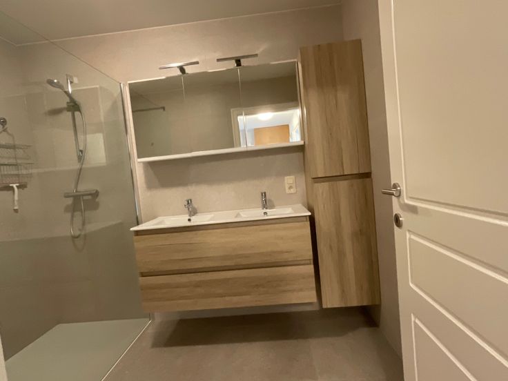 De nieuwe badkamer heeft een inloopdouche en een dubbele lavabo.