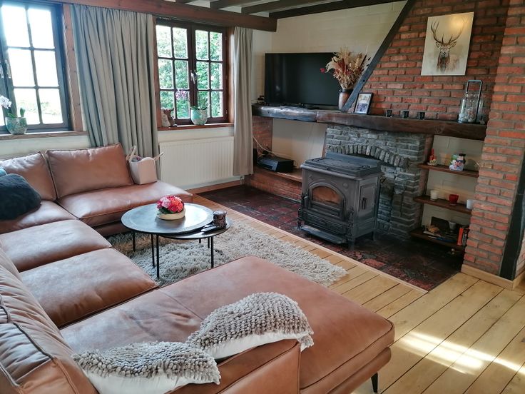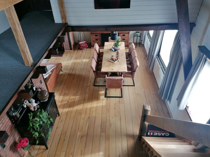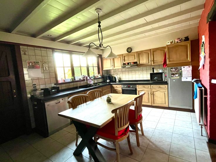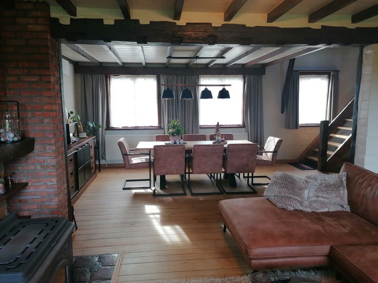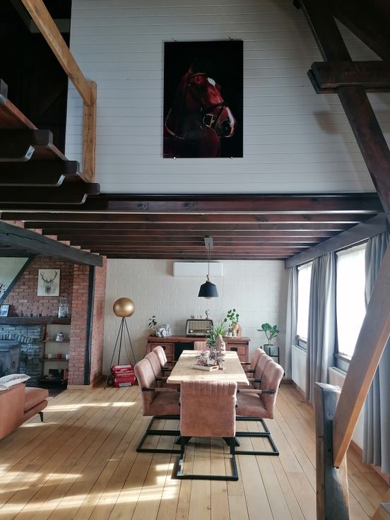 - Aaneengesloten woonkamer en eetkamer, uitgerust met airco en houtkachel.