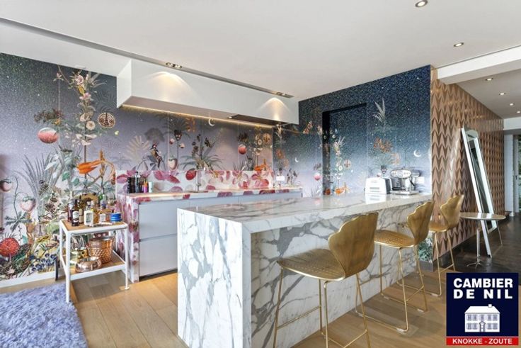Genietende van frontaal zeezicht en enorme gevelbreedte aan het Albertstrand te Knokke. Indeling: Inkomhall met vestiaire. Brede woonkamer met eet-en zithoek uitgevend op het terras en volledig geïnstalleerde, open keuken (Gaggenau huishoudtoestellen). Bijkeuken aanwezig met oven, microgolf, wasmachine- en droogkast aansluiting en plaats voor vriezer. Achteraan het appartement bevindt zich de masterbedroom met volwaardige badkamer (ligbad, lavabo, toilet), tweede volwaardige slaapkamer met eigen doucheruimte. Beide slaapkamers geven uit op het terras. Derde slaapkamer werd uitgerust met stapelbed. Gastentoilet aanwezig. EPC: 106 kWh/m²