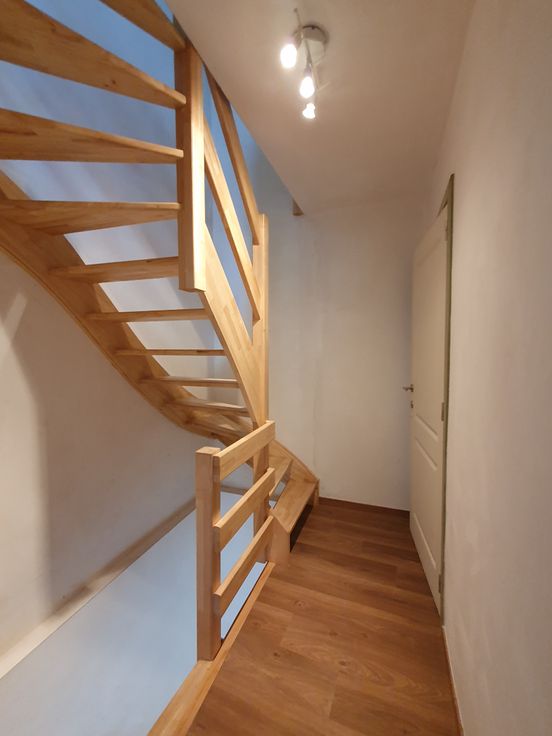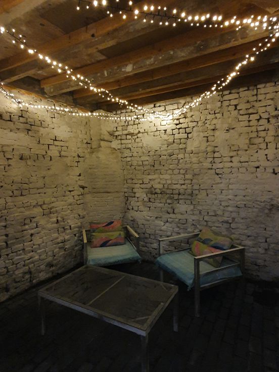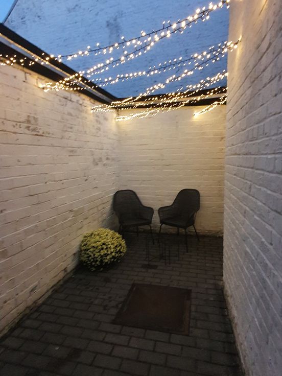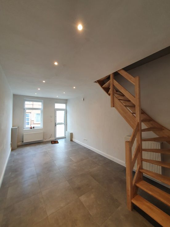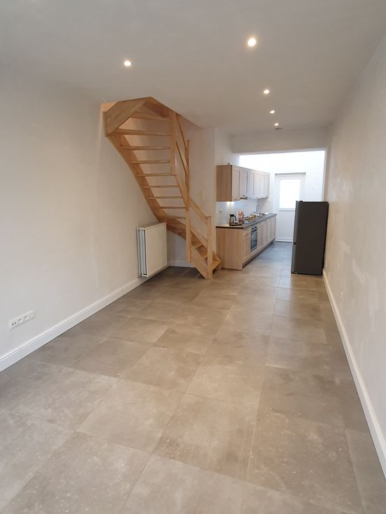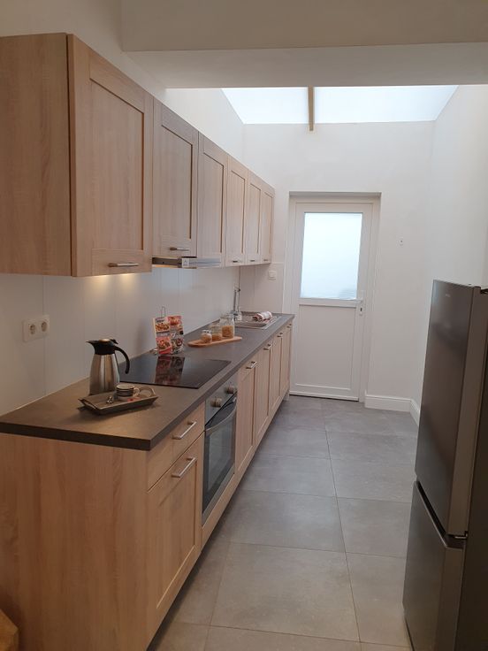 Gelijkvloers: knusse leefruimte, splinternieuw ingerichte keuken (oven, vrijstaande koelkast met diepvries, keramische kookplaat, enkele spoelbak en vaatwasser) en twee sfeervolle koertjes (eveneens bereikbaar via gemeenschappelijke losweg, makkelijk voor fiets op te bergen)