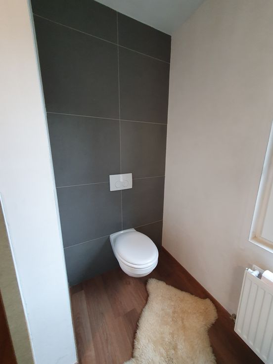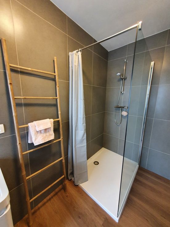 1ste verdiep: ruime slaapkamer en badkamer met inloopdouche, badkamermeubel en hangtoilet.