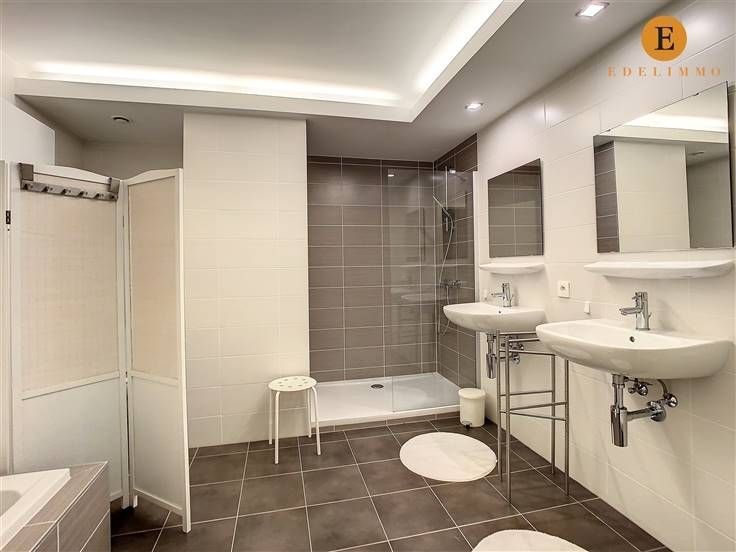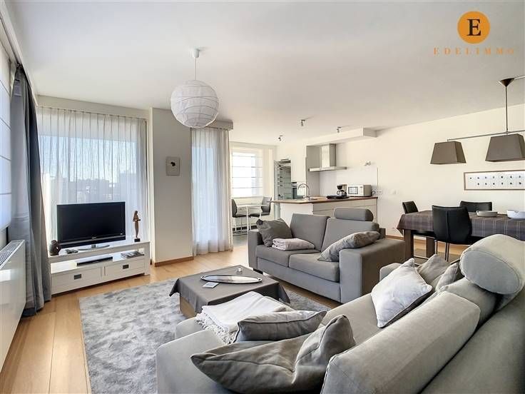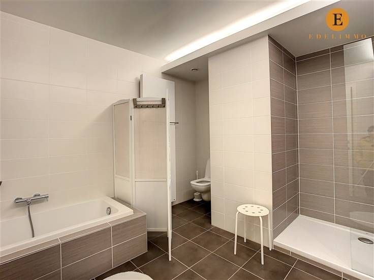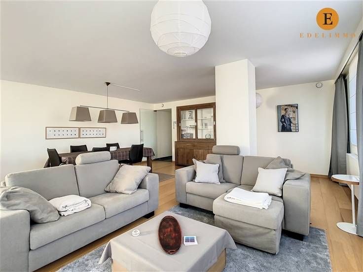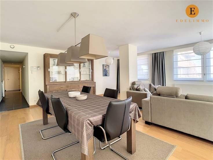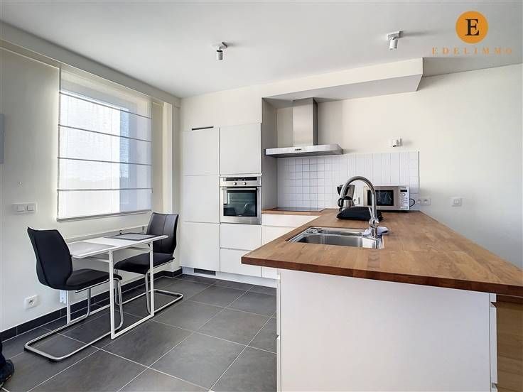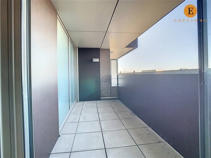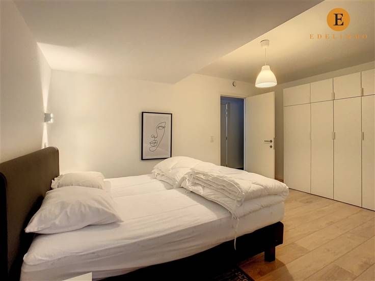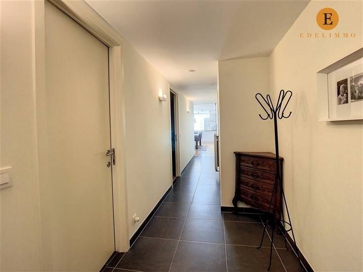 Indeling: inkomhal, lichtrijke living met eet- en zithoek, 2 terrassen, open volledig ingerichte keuken, grote slaapkamer, badkamer met bad, toilet, douche en 2 wastafels, berging met wasmachine, private kelder, fietsenberging in het gebouw, autostaanplaats nr. 8 (verdiep -1) en kelderberging nr. 113 (verdiep -2)