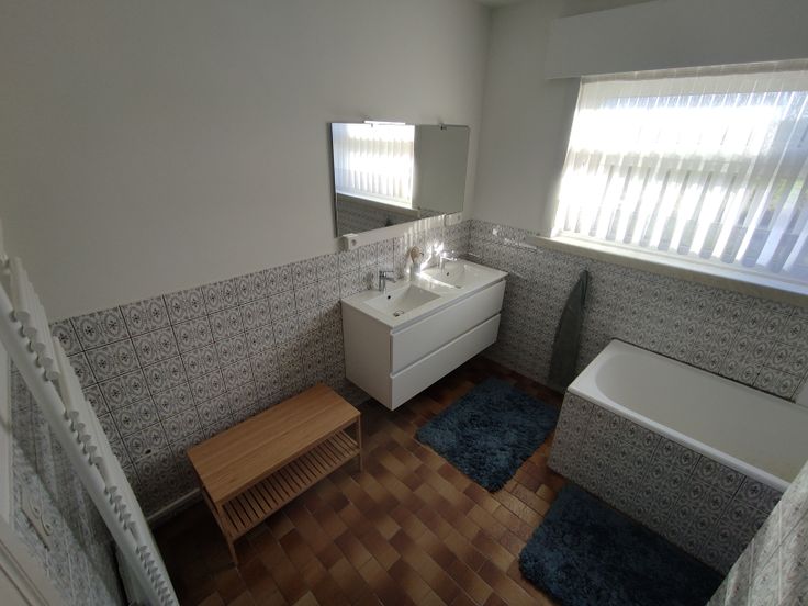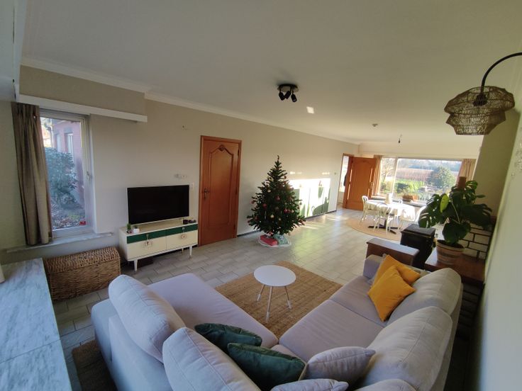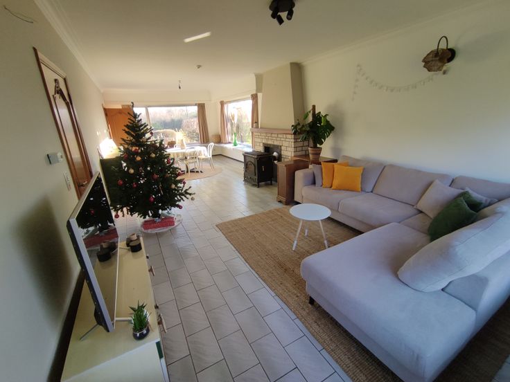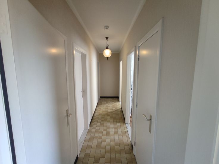 We betreden de woning langs de voordeur en komen in de ruime inkomhal. De deur door komen we in de ruime living uit met veel licht door de grote ramen. Het kleine inkomhalletje achteraan bied aansluiting tussen de keuken, living en koele berging. De keuken door vinden we de gang die ingang biedt tot de 4 slaapkamers, badkamer en afzonderlijke WC.