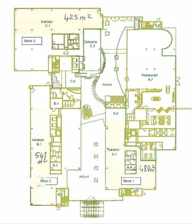 De 3 oppervlaktes op het gelijkvloers kunnen eventueel gecombineerd worden, wat een totale oppervlakte van 1.454m² oplevert.