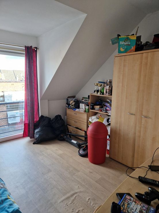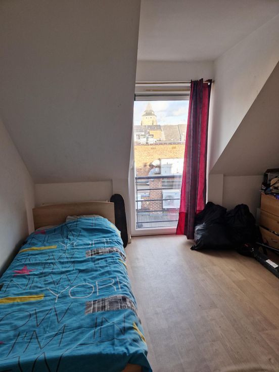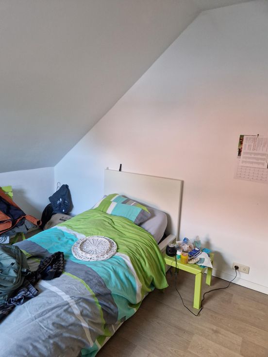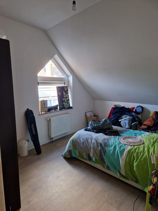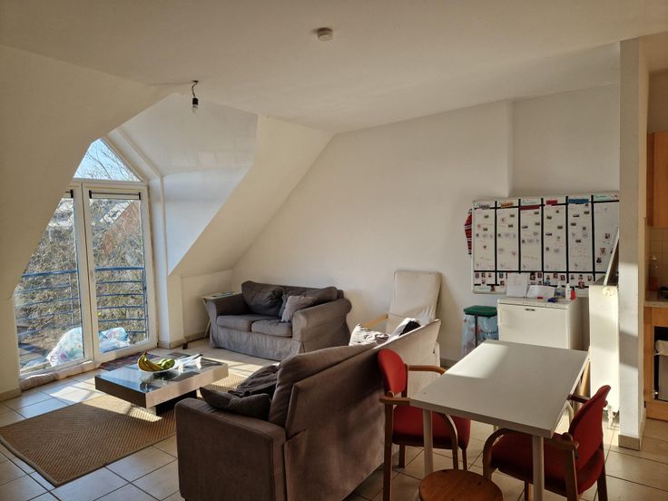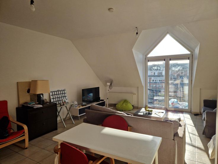 Bel appartement 2 chambres de +/- 75 m² mansardé situé au dernier étage de l'immeuble avec ascenseur comprenant : un hall d'entrée, un living avec coin cuisine, deux chambres, une salle de bain, un wc, une buanderie et une cave.