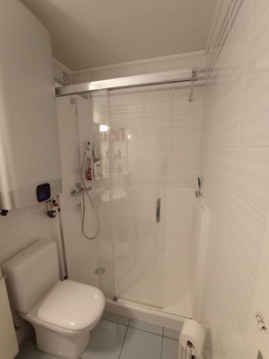 1 salle de bain avec nouvelle douche de plain pied, meuble- lavabo et wc.