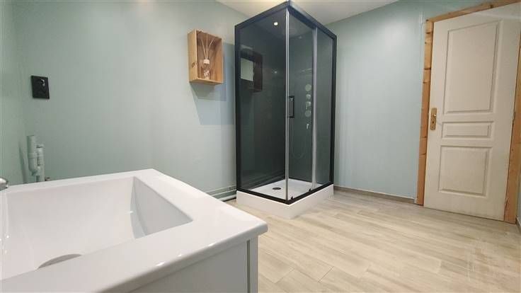 Au rez-de-chaussée : un salon-salle à manger en enfilade suivi d'une grande et récente cuisine complètement équipée, La salle de bain se trouve également dans le prolongement avec le wc et la buanderie.