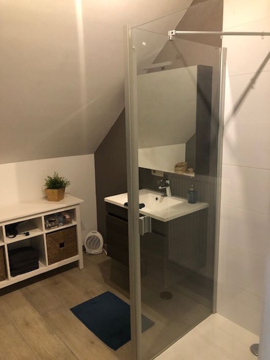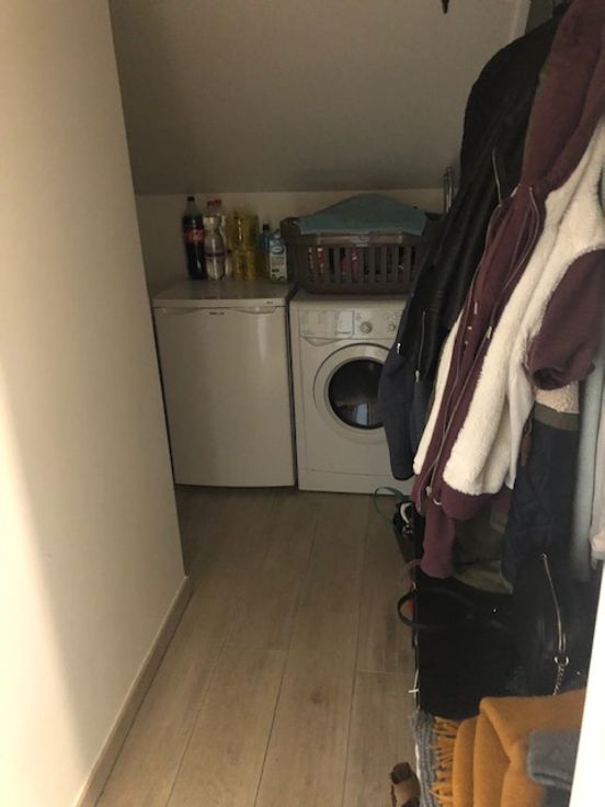 We komen het appartement binnen in de gang, met rechts een apart toilet en links een gerieflijke berging (voor wasmachine, droogkas, enz) Verder vinden we aan de rechterkant de badkamer met douche en enkele wastafel.