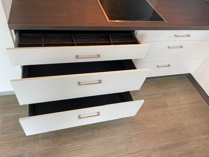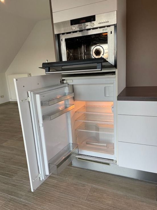 Aan de overzijde bevindt zich de ruime slaapkamer met ruimte voor een dubbel bed, een grote kast en een zithoek. Als we verder de gang ingaan, komen we in de living/eethoek met aan de linkerkant een prachtige open keuken voorzien van alle comfort (el.kookplaat, ijskast, dampkap, vaatwasser, combi oven enz.) en veel kastruimte. De woonkamer geeft uit op een prachtig terras van 7,5 m².