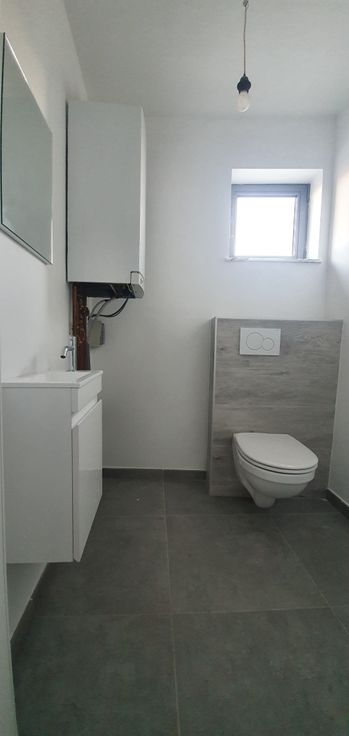 Hall d'entrée, living, cuisine équipée avec lave vaiselle tous les électroménagers sont de marque Smeg, buanderie, chaudière au gaz, salle de bain avec baignoire et wc séparé.