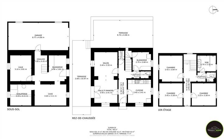 Le bien comporte : le hall d'entrée, salon/salle à manger, cuisine, buanderie, 3 chambres, sdb, wc, cave et garage.