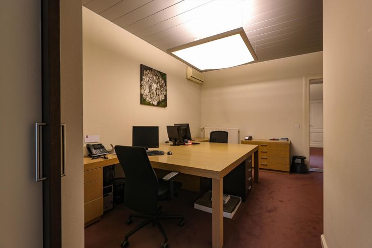 De eerste verdieping beschikt over 5 kantoorruimtes waarvan 2 met ingebouwde kasten, een grote vergaderruimte met zicht op de markt en een toilet.