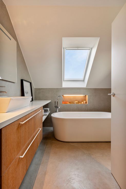 De duplexverdieping is bereikbaar via designtrap in de woonkamer en is ingericht met een nachthal, wasruimte, tweede toilet, twee ruime slaapkamers waarvan 1 voorzien van een dressing en de badkamer met dubbele lavabo, bad en een douche volledig afgewerkt in de mortex.