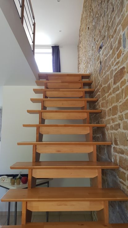 Au rez-de-chaussée, la maison comporte une cuisine équipée (hors frigo) -salle à manger (une pièce). Le premier étage est composé d'un salon, d'une salle de bain avec douche italienne et d'une toilette (séparée). Le deuxième étage comporte deux chambres mansardées et une petite mezzanine idéale pour le rangement.