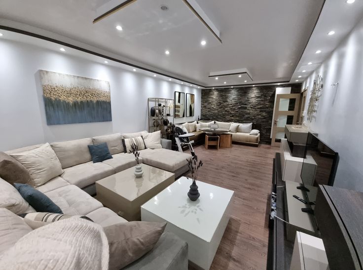 Vaste living/salle à manger de 30 m² avec un parquet semi-massif, baigné de lumière grâce à une terrasse exposée plein sud.