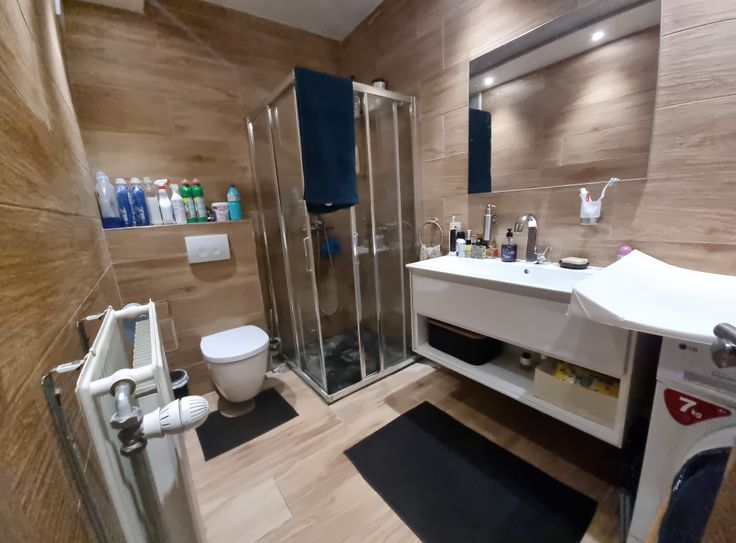 2 salles d’eau modernes, l’une équipée d’une douche, meuble lavabo et WC, et l’autre disposant d’un branchement pour une machine à laver.