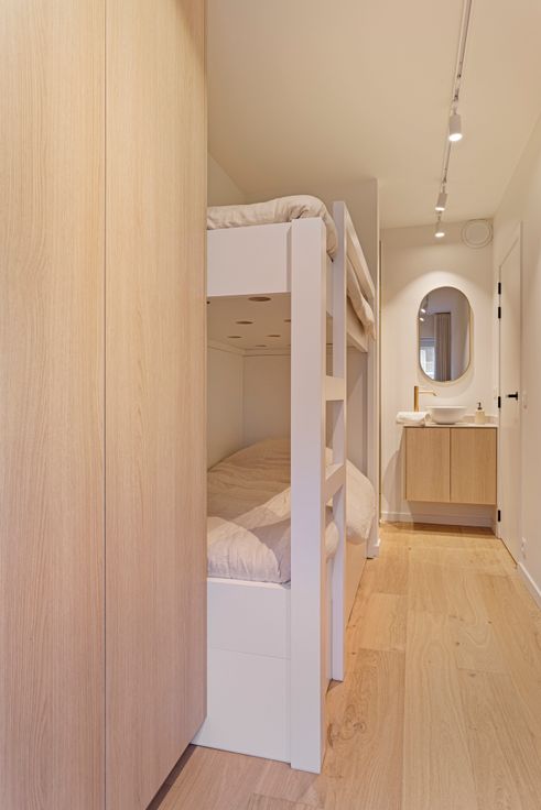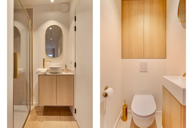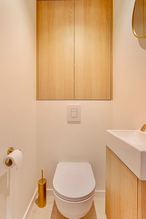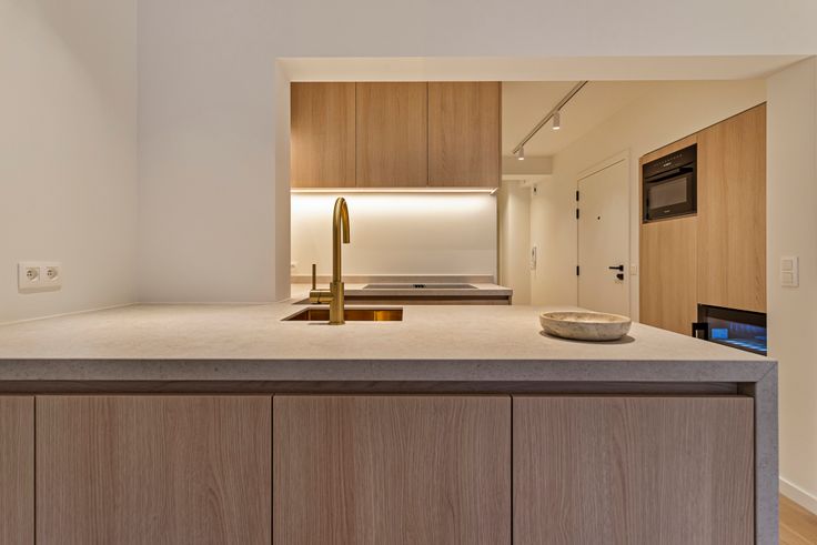 INDELING: inkom met gastentoilet. Open en lichtrijke leefruimte met eetkamer welke uitgeeft op het zuidgerichte terras (met zonneluifel). Volledig uitgeruste keuken met Miele apparatuur en wijnkoelkast. Berging met aansluiting voor wasmachine/droogkast. 2 slaapkamers met ingebouwde kasten. Slaapkamer 1 is voorzien van een en-suite badkamer. Slaapkamer 2 werd uitgerust met aparte douche en lavabomeubel. Privatieve kelderberging. Fietsenberging op gelijkvloers.