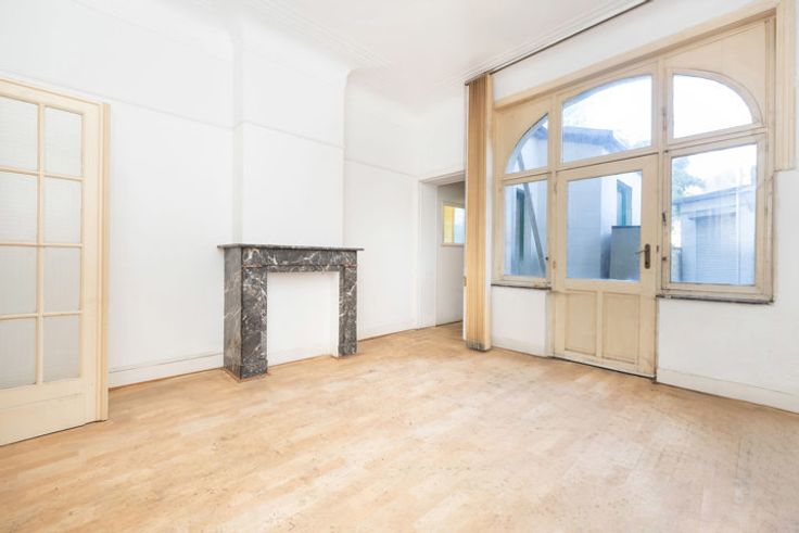 Aan de mooiste laan van Schaarbeek, op de begane grond van een herenhuis uit 1931 met een brede koetspoort, ligt aan de linkerkant dit elegante kleine voorhuis van 68 m² dat gerenoveerd moet worden en, aan de achterkant van het gebouw, een grote ruimte van 86 m² voor kantoor, opslag of commercieel gebruik. Het woongedeelte bestaat uit drie aangrenzende kamers met houten vloeren, die uitkijken op de binnenplaats en de kleine tuin aan de achterkant van het pand. Een nieuwe keuken en badkamer zijn gepland. Aan de achterkant van het gebouw, aan het einde van de koetspoort, bevindt zich het bedrijfsgedeelte: drie grote aangrenzende kamers van 86 m² met kitchenette en toilet met toegang tot de tuin. EPB: G voor beide delen. In feite kan dit pand worden gebruikt voor een mix van accommodatie en professionele activiteit, hoewel de bouwvergunning aangeeft dat de hele begane grond voorlopig een “bedrijf” is.