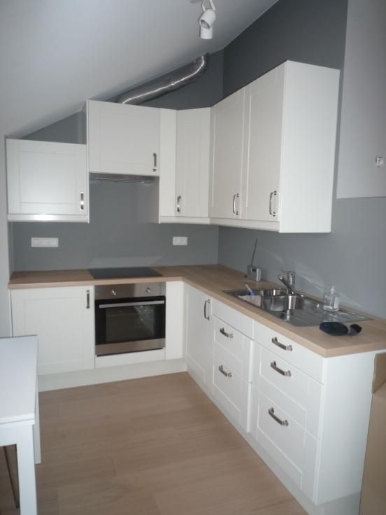 Équipements : réfrigérateur, four, plaque à induction, hotte, table, chaises.