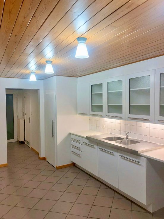 une large cuisine ouverte, semi-équipée + coin buanderie,