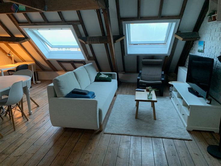 Dit sfeervolle dakappartement combineert karaktervolle elementen met eigentijds comfort. De bakstenen muren en zichtbare houten balken zorgen voor een warme, unieke sfeer, ideaal voor wie houdt van charme en authenticiteit.
