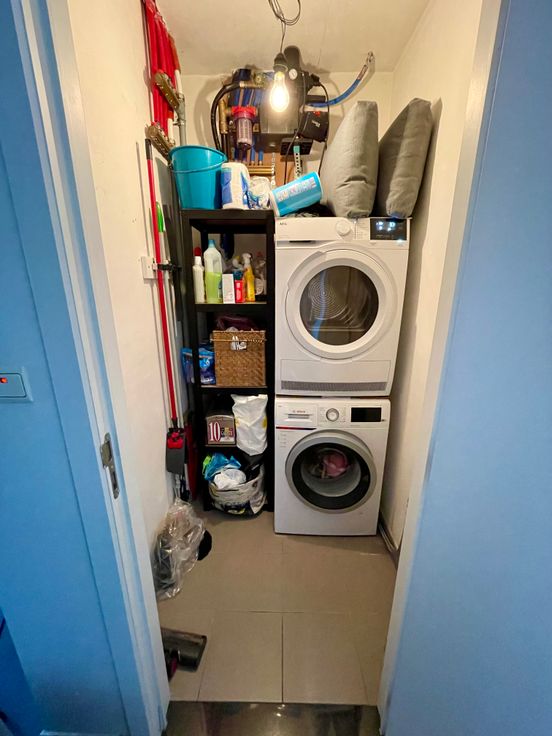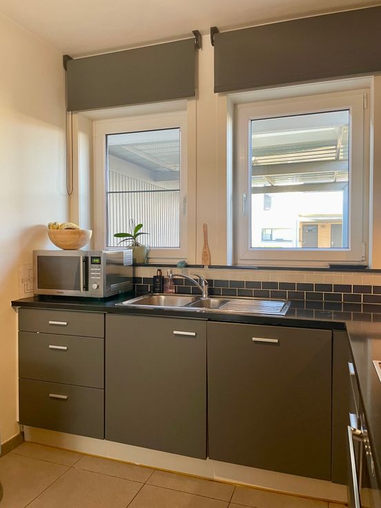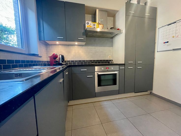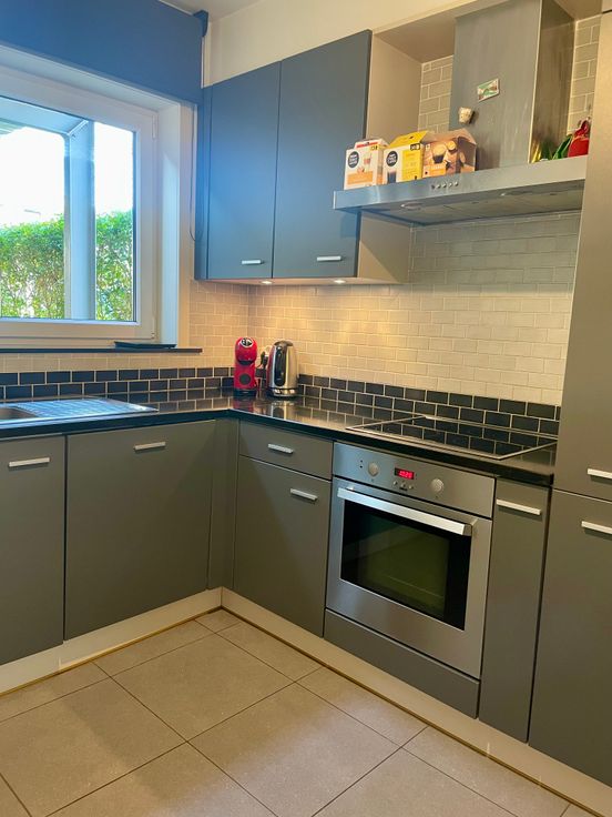 Gelijkvloers: inkomhal met ingebouwde kast en afzonderlijk gastentoilet met lavabo - lichtrijke living met grote raampartijen - ingerichte keuken (koelkast met diepvriezer, elektrische kookplaat, dampkap, oven, dubbele spoelbak en vaatwasmachine) - berging met voorzieningen voor wasmachine en droger.