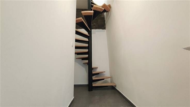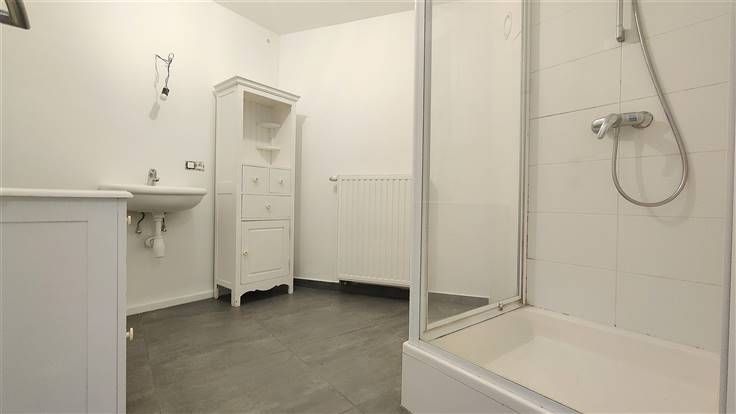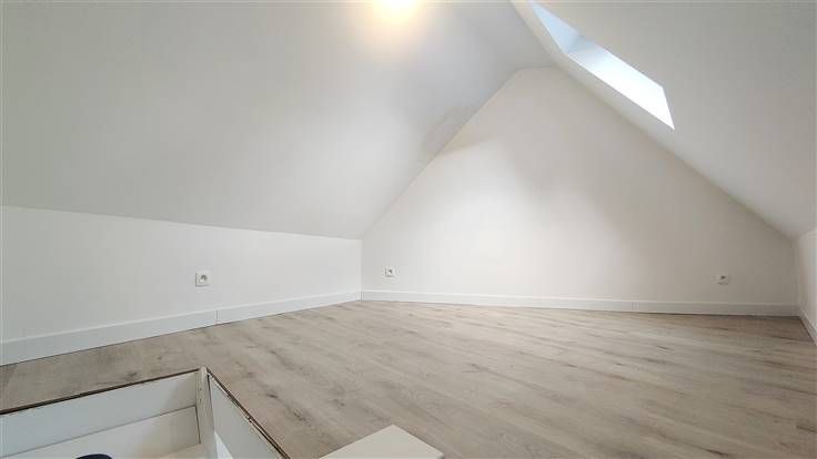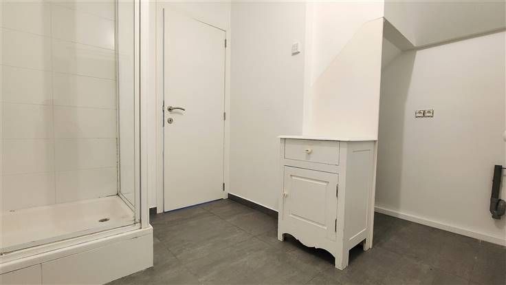 Toujours au rez-de-chaussée, vous trouverez une première chambre lumineuse, une salle de bains avec douche, vasque, ainsi que les raccordements pour votre machine à laver. Un espace technique servant de chaufferie sera également utile pour le stockage.